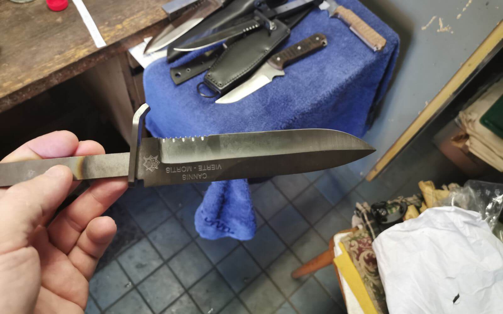 Na fotografiích vidíte další falzifikát vojenského nože Falco, vyrobený p. Maďaričem. Na noži nesedí značení loga na první straně — v místě kde je logo výrobce má být znak útvaru a logo výrobce má být na druhé straně čepele. Na druhé straně čepele nesedí číselné značení a obě čísla jsou úplný nesmysl a chybí tam i výrobní série.