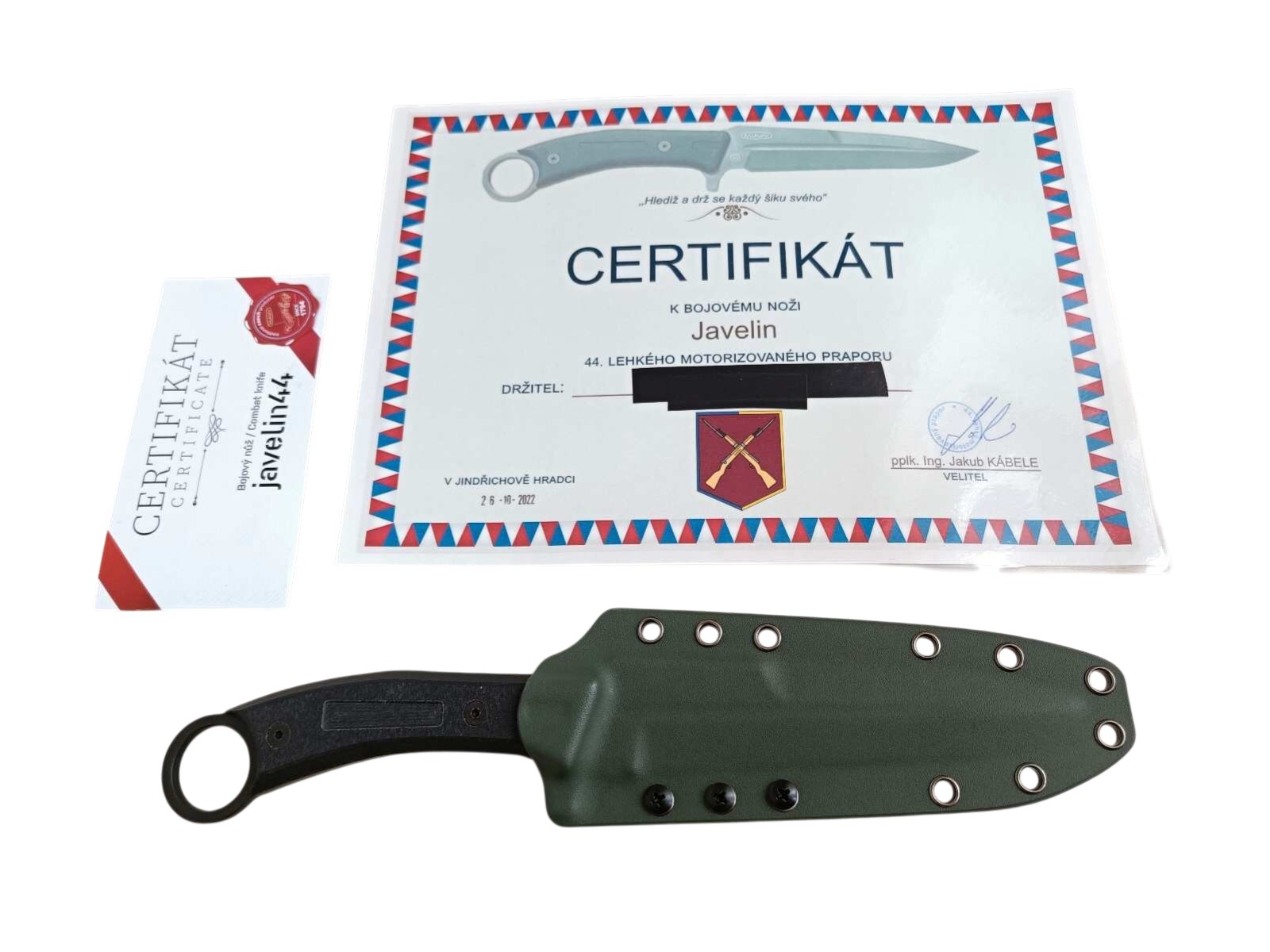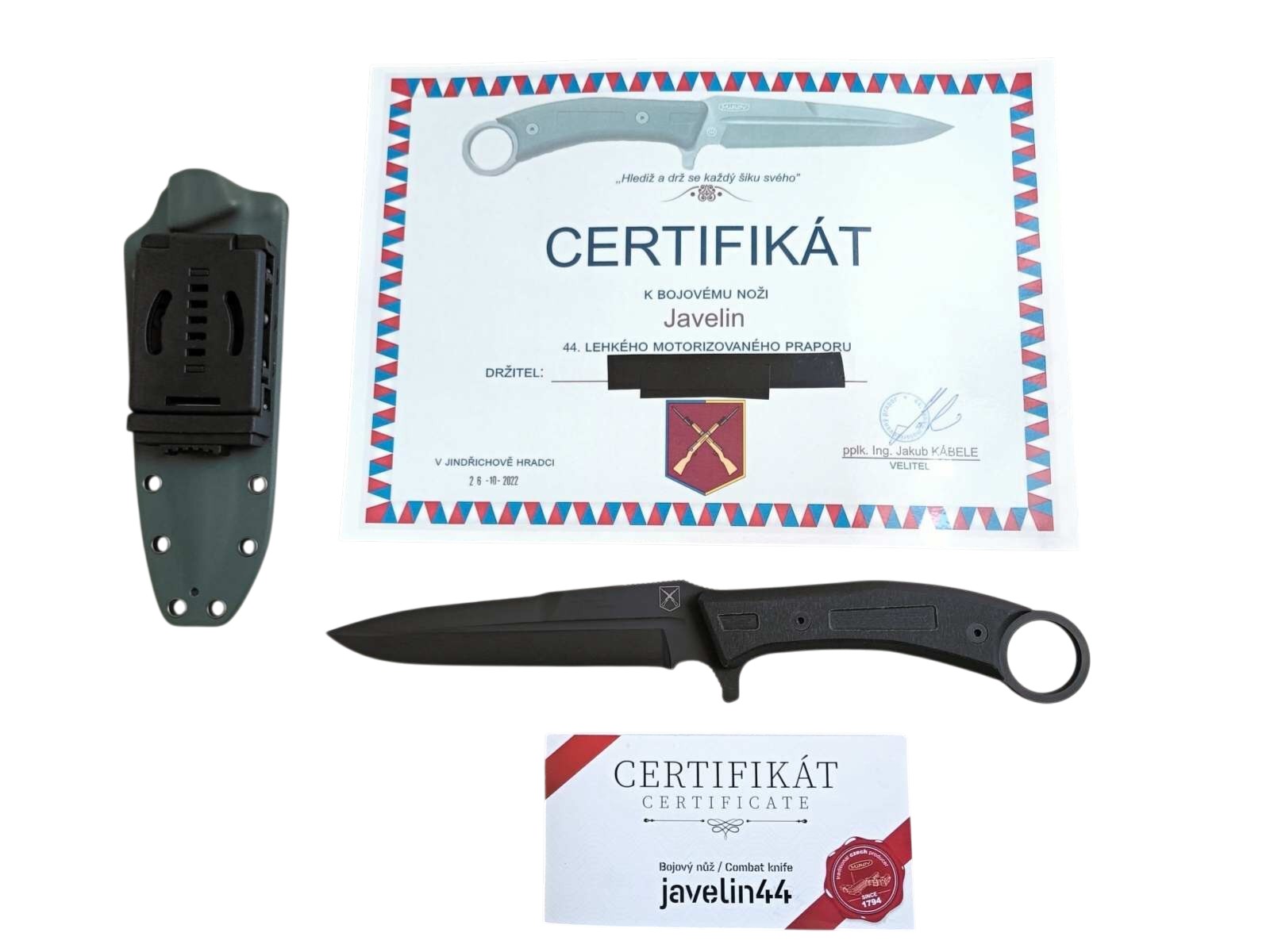 Dne 26. října 2022 byly nože slavnostně předány s certifikátem. Vyroben z oceli Böhler N690, tvrdost 57–60 HRc, délka čepele 150 mm, celková délka 298 mm. Rukojeť z G10, kydexové pouzdro s Tek-Lokem od nožíře Jindřicha Kutila.
