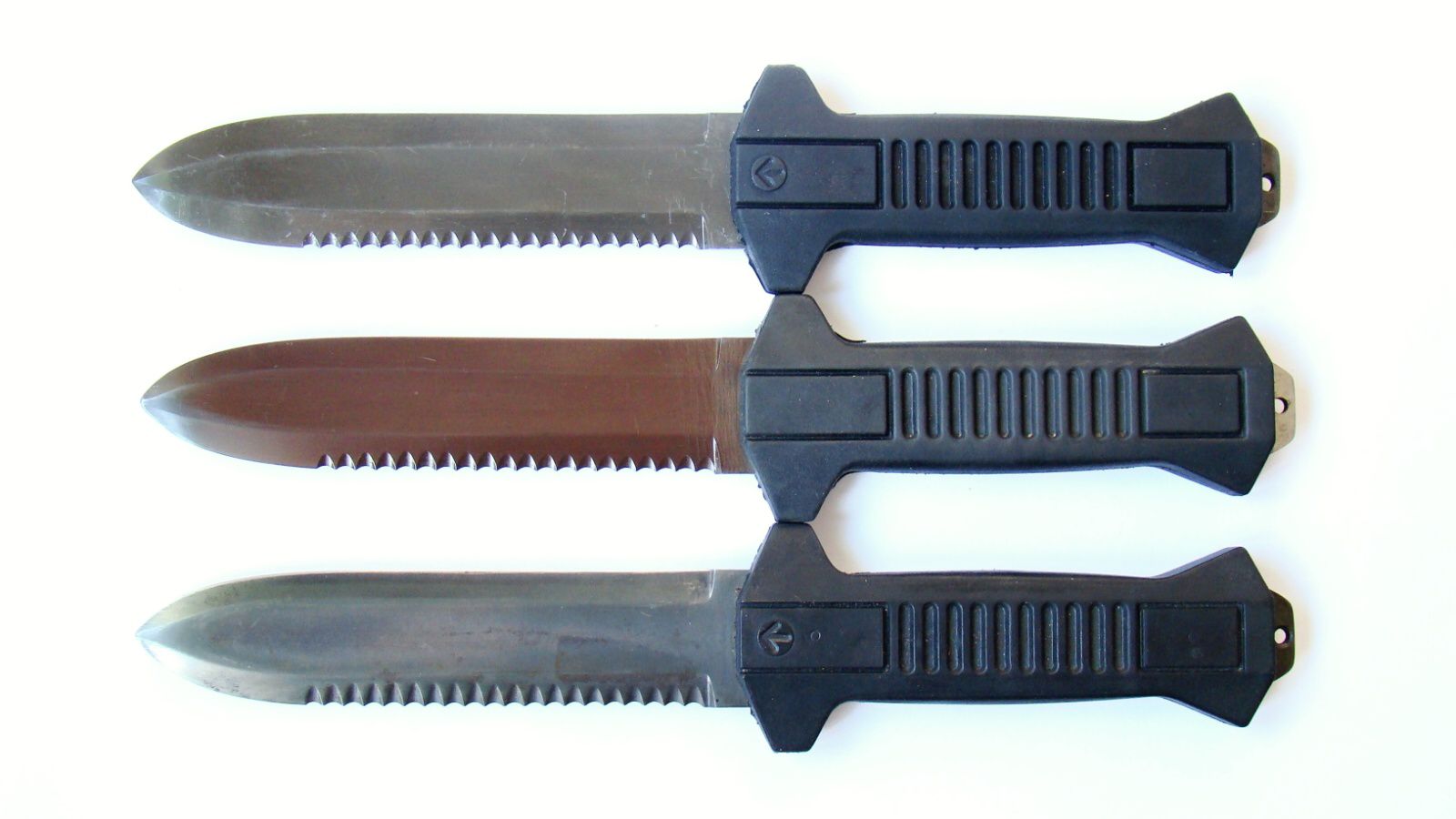 Přehled typů nože BONUS vz.85 — základní verze, AQUASUPER varianty a cvičný nůž.