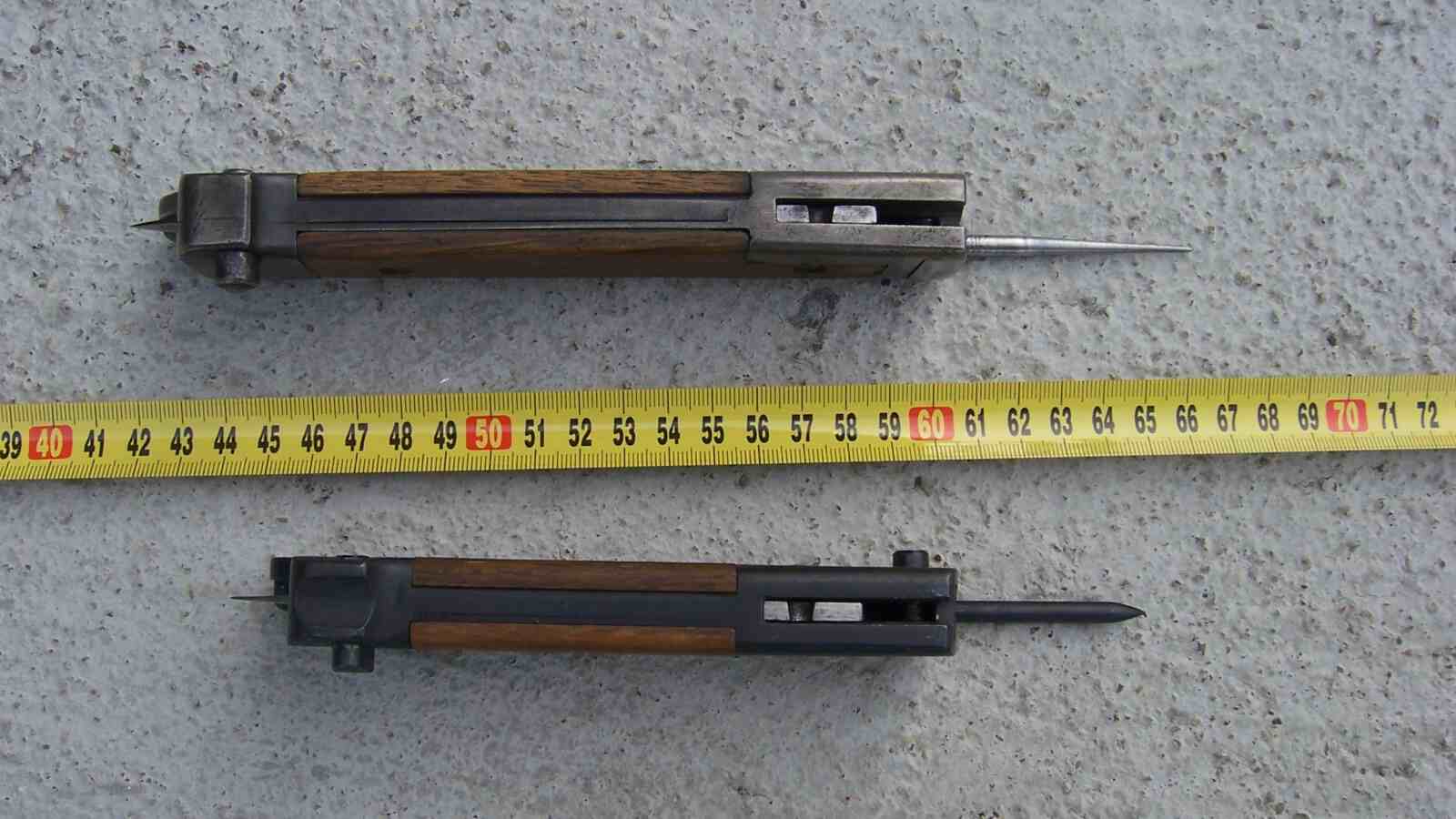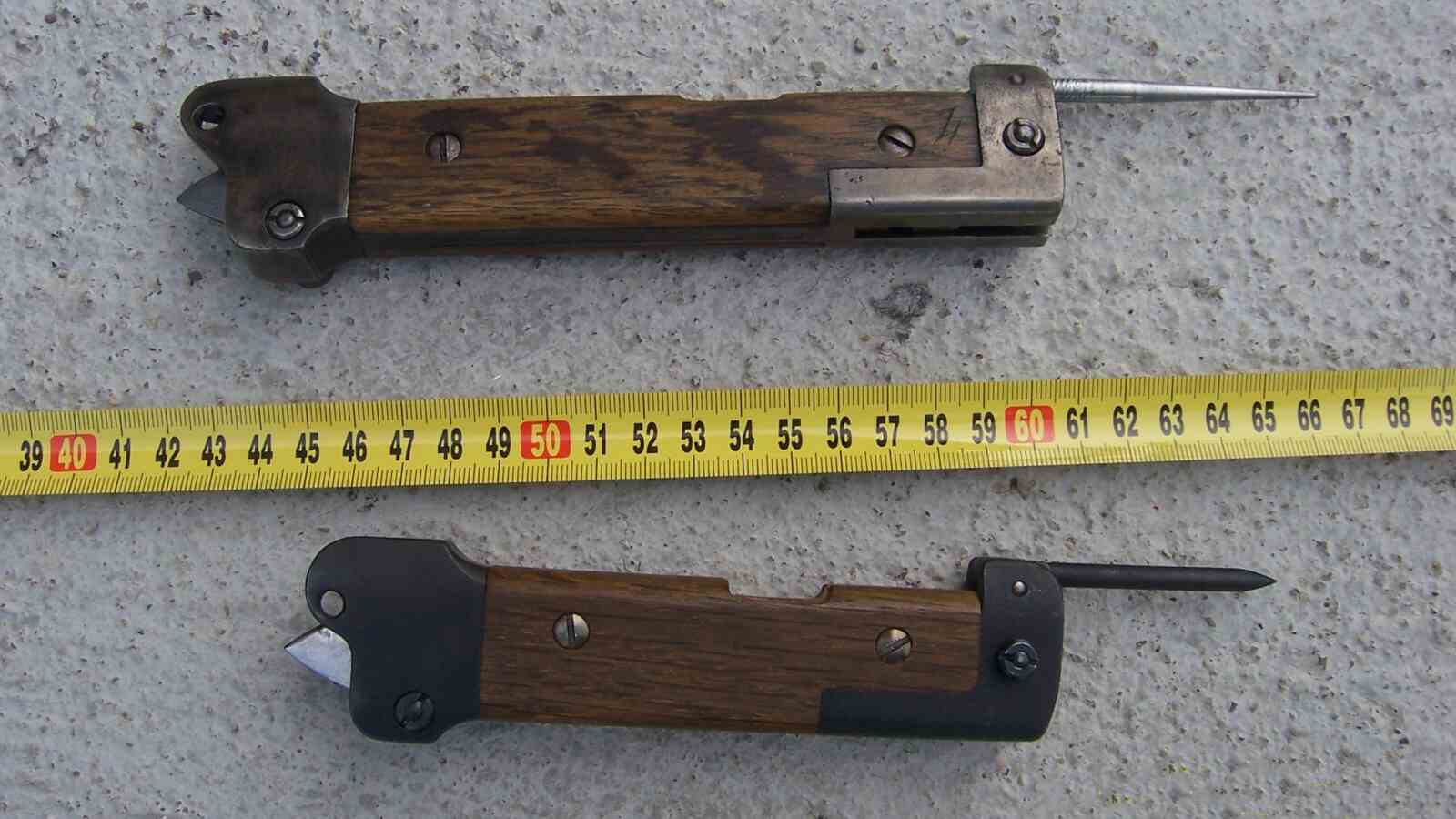 Na čepeli se středovým hrotem je 15 mm od hrotu ozub, na kterém je možno čepel zajistit skoro v zasunutém stavu — v této poloze spolu s bočním úchytem tvoří otvírák na konzervy. Střenky jsou dřevěné a každá je k noži připevněna dvěma zapuštěnými šrouby M4. Všechny uvedené rozměry jsou pouze přibližné, určené z fotografie.