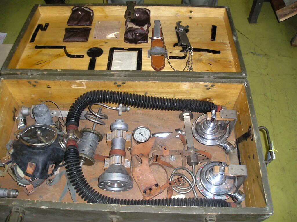 Potápěčský nůž ze soupravy PL 40, uložený ve víku dopravní bedny. Vyráběn pravděpodobně v 50.–60. letech.