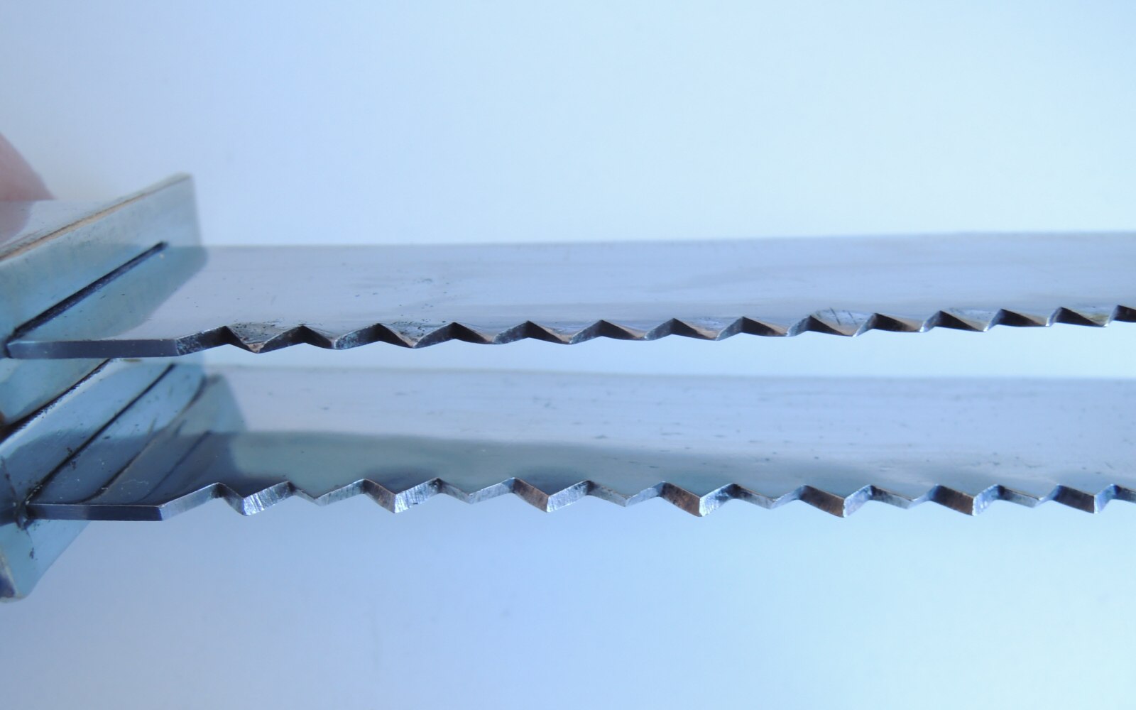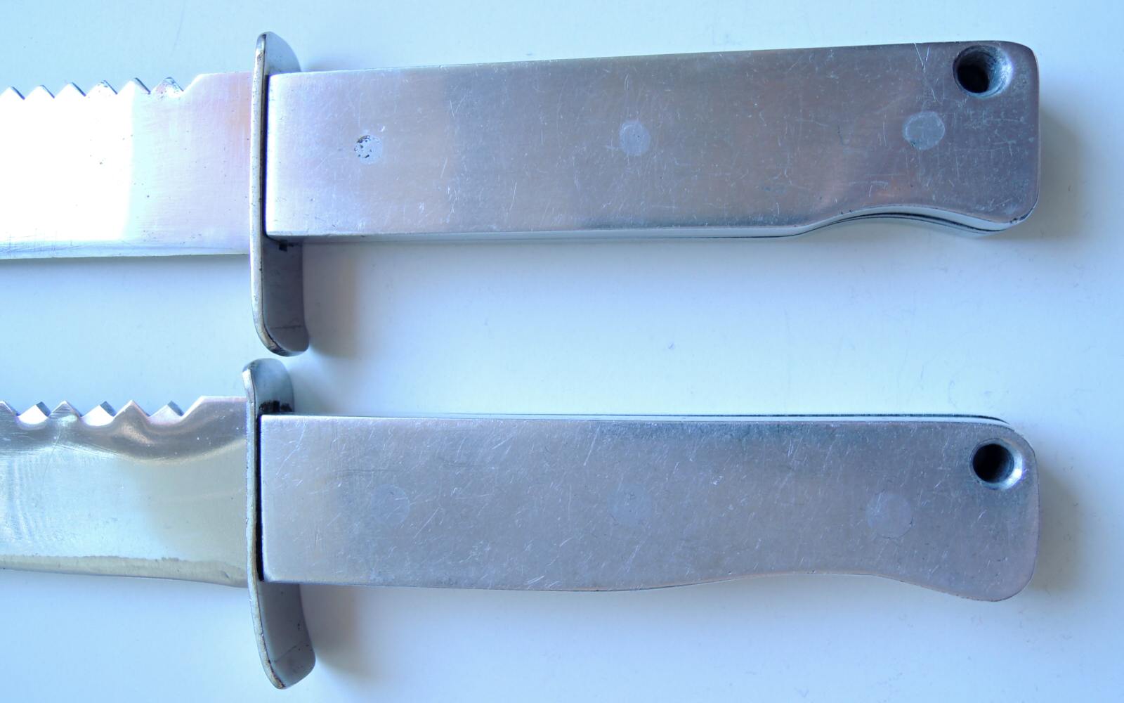 Existuje také druhá varianta nože s větším vybrání pro prsty na rukojeti a oboustranně broušenými zuby na hřbetu čepele. Kožená pochva má u ústí přinýtovanou destičku z ocelového plechu se zahnutými raménky jako náhrada obůstku. Bohužel kožené pochvy při styku s vodou tvrdly a napouštěly se olejem — většina dochovaných pochev je ve stavu patrném na fotografiích.