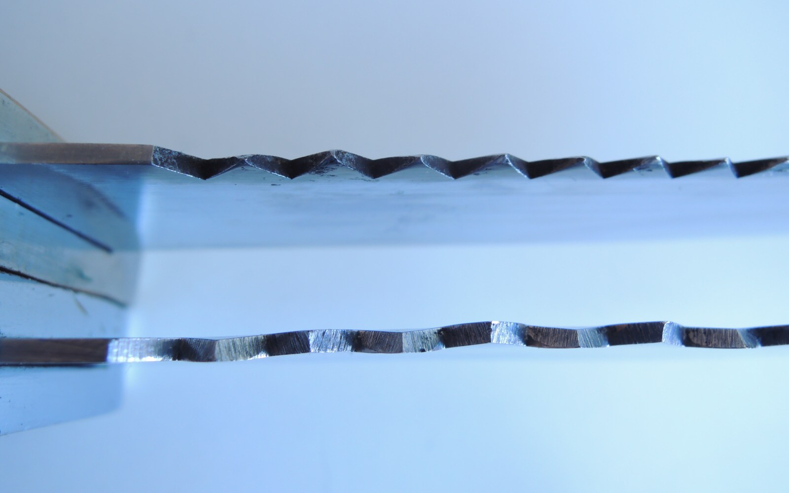 Čepel nože je přímá dvoubřitá se středovým hrotem, pochromovaná a vyleštěná. Na horní straně čepele je 21 jednostranně broušených pilových zubů. Rukojeť tvoří dvě hliníkové střenky spojené přes stopku čepele třemi zapuštěnými hliníkovými nýty. Dolní strana rukojeti je tvarovaná pro ruku. V horní části rukojeti je otvor pro kroužek s článkovým hliníkovým řetízkem (~100 cm) zakončeným karabinkou.