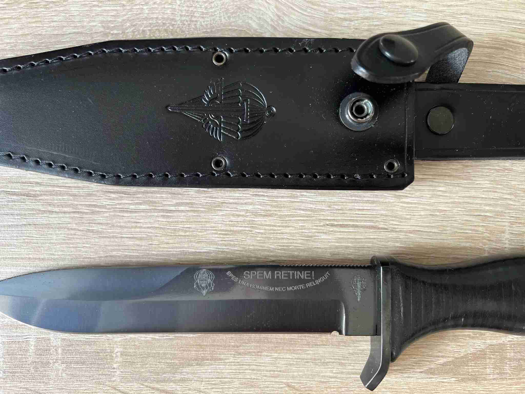Na fotografiích vidíte falzifikát vojenského nože Falco, vyrobený p. Maďaričem. Na noži nesedí značení loga na první straně. Tohle značení nebylo na sérii D, kterou je nůž označen na druhé straně. Pořadové číslo 15 je také nesmysl a absolutně nemůže sedět s rokem výroby 2019 uvedeným na noži. Číslo 015 bylo vyrobeno v roce 2008 a jako důkaz tady dávám fotografii pravého Falca z roku 2008 série D s pořadovým číslem 18. Další co si můžete všimnout je barva kožených kroužků — v roce 2008 kdy bylo pravé Falco vyrobeno jsou hnědé, tady na falzifikátu jsou z tmavě modré až černé kůže, tedy kůže kterou výrobce začal používat o několik let později až mu došla hnědá kůže.