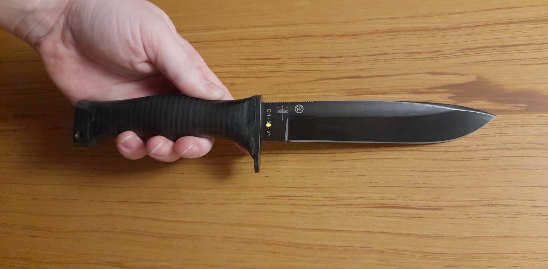 První blbost je značení — rok 2021 na noži byl rok kdy si už nůž Cháron vyráběl samotný útvar v Chrudimi. Další chyba je pořadové číslo, které je dnes už přes 450. Další nuance je barva značení, odstín čepele i materiál čepele. Z Elmaxu nikdy vyráběn nebyl. Blbost je i to že je na noži značka M jako Maďarič, protože to už na nožích vyráběných od roku 2020 samotným útvarem není.