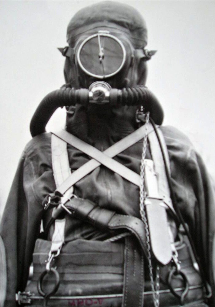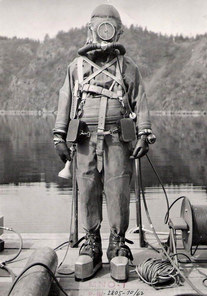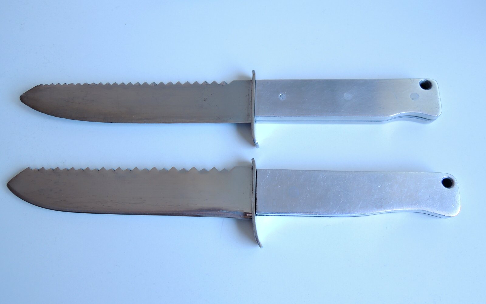 Potápěčský nůž ze soupravy PL 40, uložený ve víku dopravní bedny. Vyráběn pravděpodobně v 50.–60. letech.