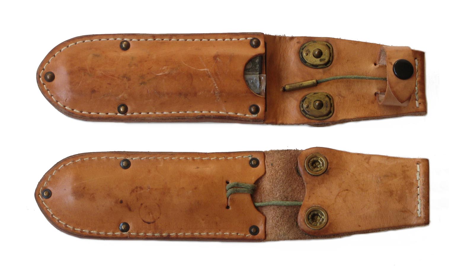 Třetí pochva — střední velikost nýtů, půlkulatá hlava z vrchu, díra zespodu. Tato pochva pro nože série 0004.
