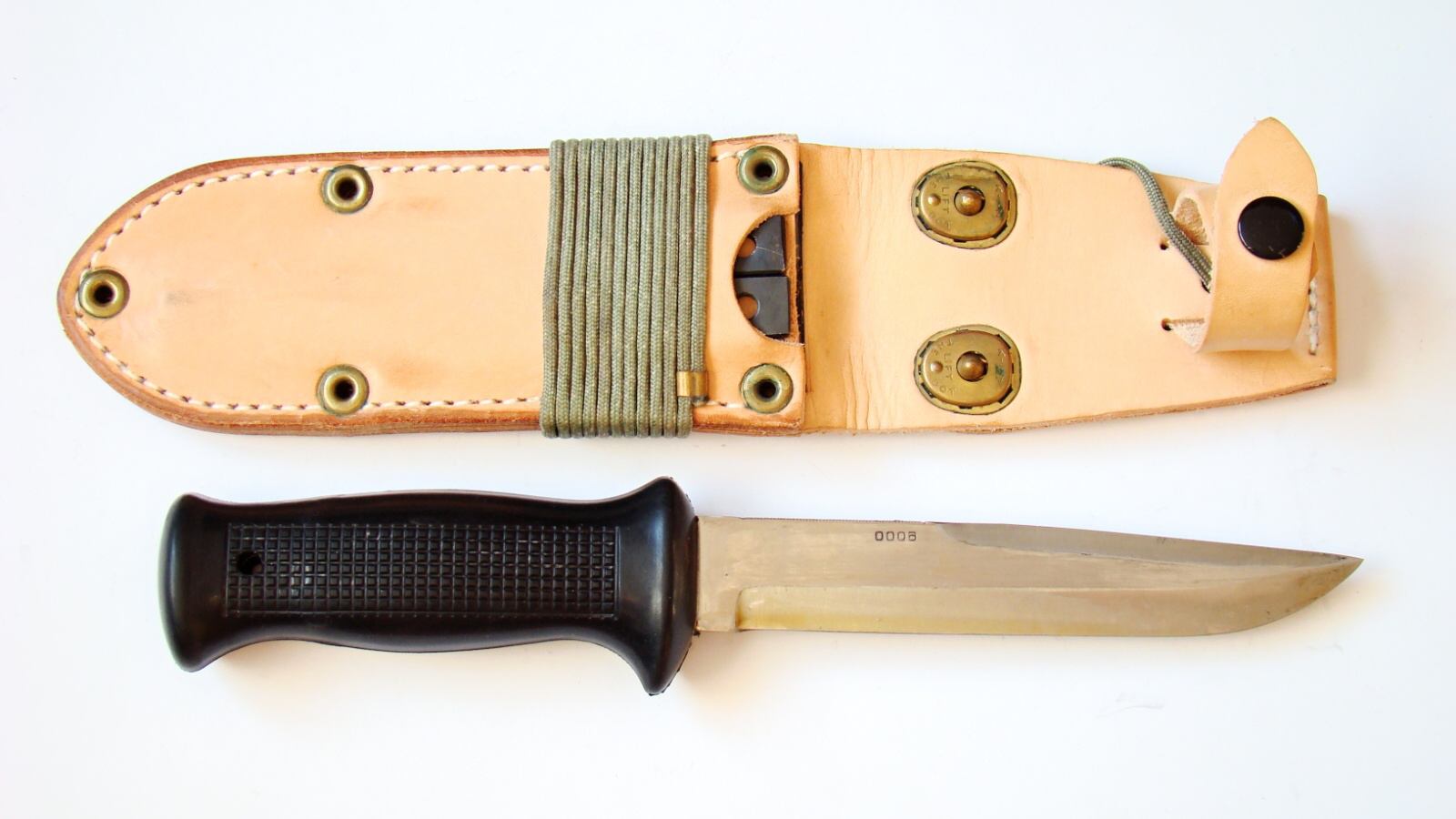 Série 0006 — poslední typ pochvy s velkými mosznými nýty, přejímací značka 1983.