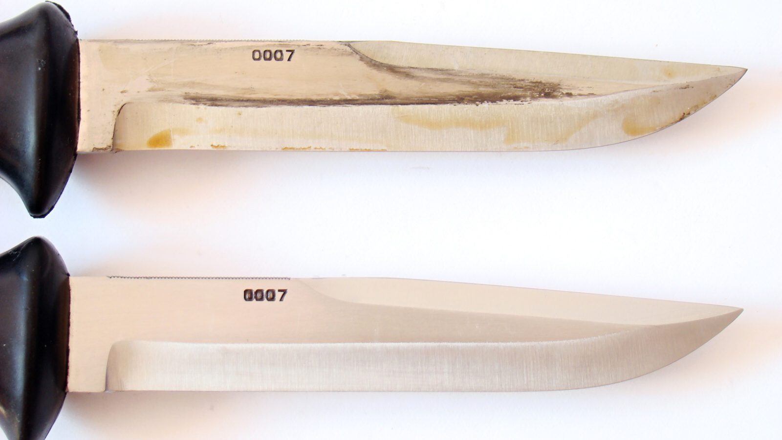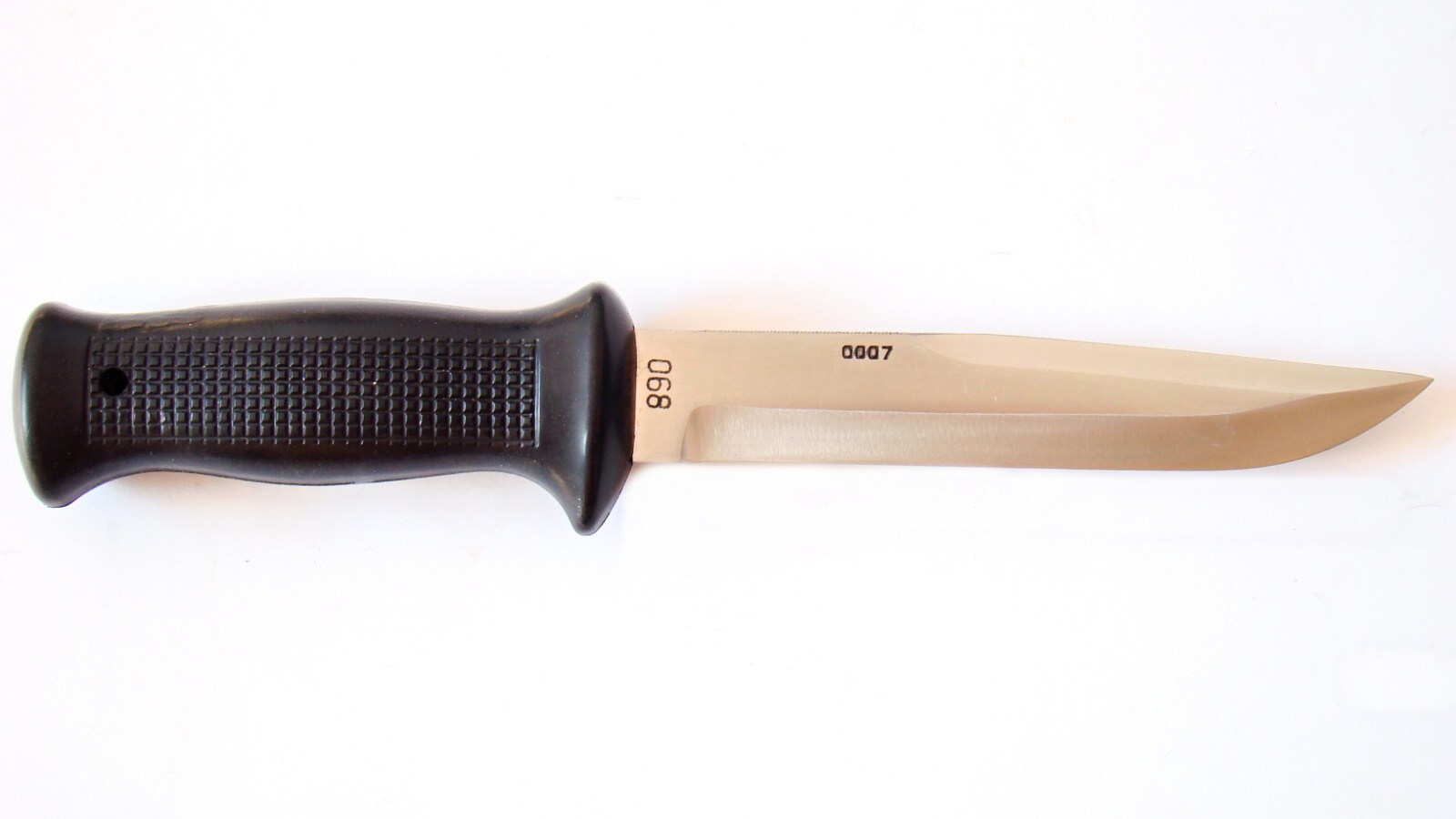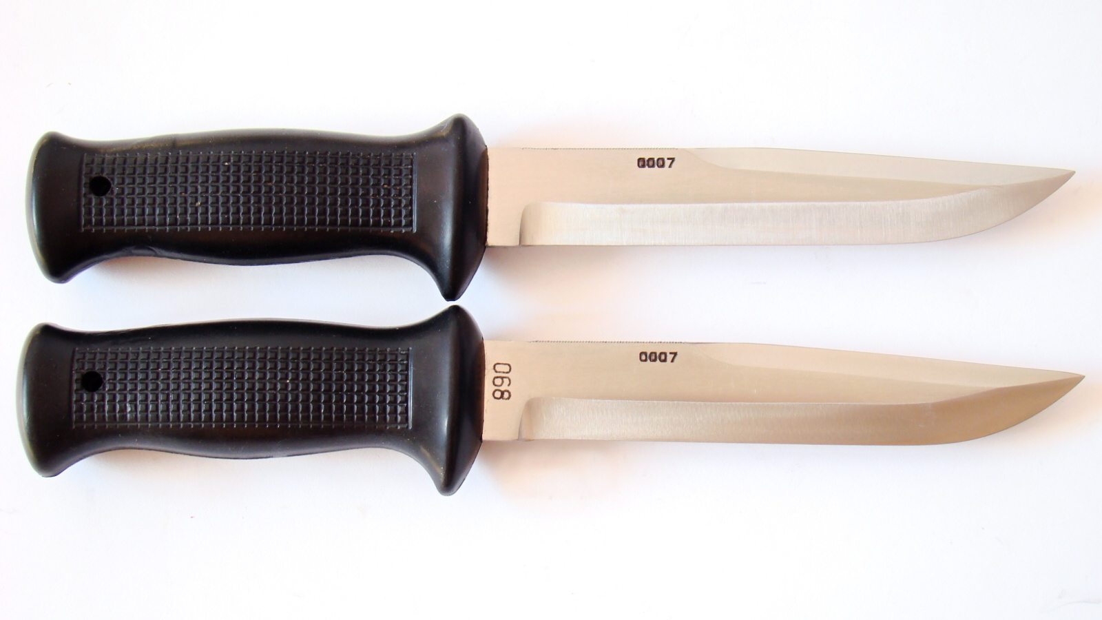 Nové nože UTON 0007 — první s konzervační vazelínou P, druhý bez. Poslední verze pochev s velkým nýtem přejatá rokem 1983.